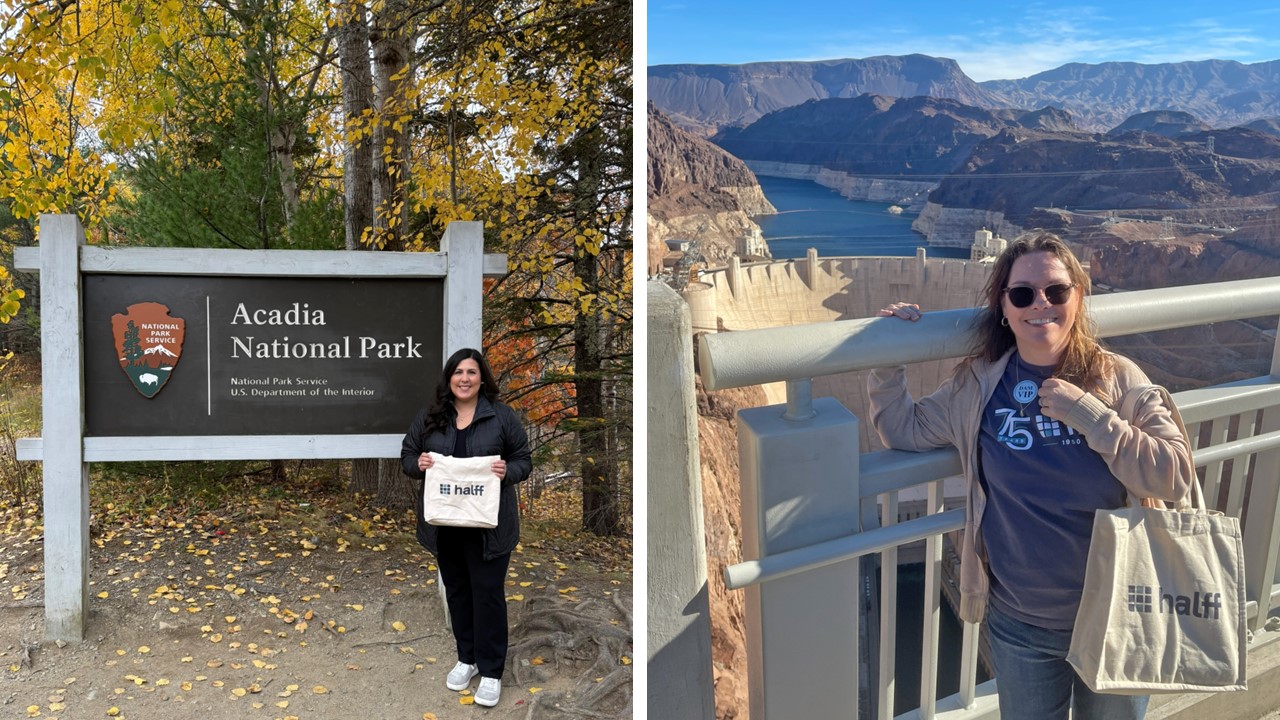 Courtney Bosquez (left) brought her Halff bag on a road trip across five national parks, visiting Mammoth Cave, New River Gorge, Shenandoah, Acadia and Cuyahoga Valley. With this trip, she has now checked off 32 national parks.